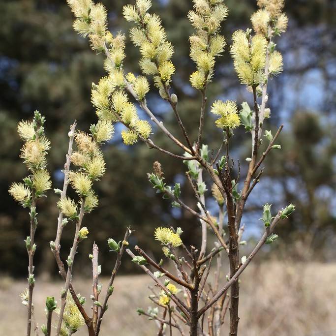 Creeping willow (Salix repens 'Iona') is a low-growing, evergreen shrub that is native to Europe and parts of North America. Growing to 30 cm (1.2 ft) tall with an upright stem, it has glossy, dark green foliage and clusters of light yellow flowers in spring and summer. This decorative, versatile shrub is an excellent choice for small gardens. It is drought tolerant and thrives in both full sun and partial shade. It tolerates all soil types, and is a low-maintenance plant with no serious pests or diseases. This quick-growing species can form dense ground cover and is ideal for brightening up shady spots or creating a focal point.