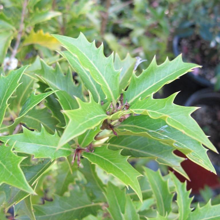 Devilwood (Osmanthus armatus) is an evergreen shrub native to China and Japan. It has glossy, dark green leaves with spiny margins and produces small, white flowers with a pleasing fragrance in autumn. The flowers are followed by oval-shaped berries that ripen to purple-blue with a white coating. This shrub can reach up to 6 meters in height and 5 meters in width, making it an excellent choice for hedging or screening. It's also tolerant of drought, full sun, and pruning, making it easy to maintain in the garden. Its common name, devilwood, originates from its hard, dense wood and spiny foliage.