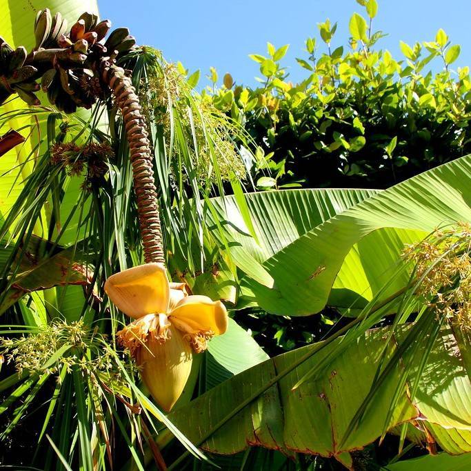 Japanese banana (Musa basjoo) is an herbacious, perennial species of banana plant native to China and Japan. It is an evergreen plant, growing up to six metres tall, and is widely grown for its ornamental leaves and yellowish-green flowers that appear in mid-summer. The fruits are small, reddish-brown and inedible. It has tough, fibrous foliage, and is very hardy, making it great for gardens in colder areas as it can survive temperatures as low as -20°C. In warmer climates, it is an excellent choice for providing a tropical feel to the garden.