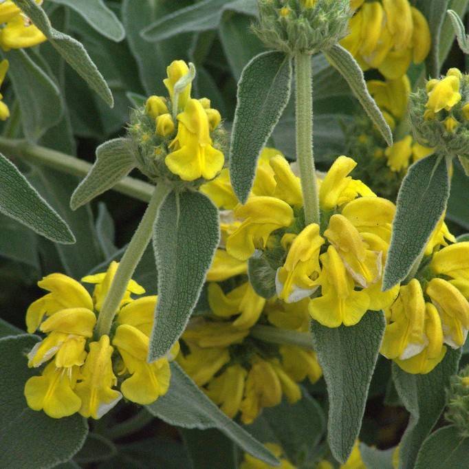 Jerusalem Sage (Phlomis fruticosa) is a striking species of flowering semi-evergreen shrub native to the Mediterranean. It has clusters of yellow-green showy flowers during the summer and creamy grey-green textured leaves. It can reach up to 4 feet in height and is perfect for summer borders and containers. Its long flowering period makes it a good companion to other flowers like roses and lavender. Jerusalem Sage is drought-tolerant and easy to care for, requiring very little maintenance after initial establishment. It can thrive in a wide range of soil conditions and is adaptable to full sun and partial shade locations. Pruning helps keep its growth in check and its foliage neat and tidy.