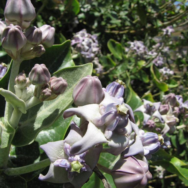 Giant milkweed (Calotropis gigantea) prefers full or partial sun, usually receiving 5 to 6 hours of direct sunlight each day. When growing in partial shade, the plant tends to be more sparse and leggy. When provided with adequate sunlight, this species produces large, heart-shaped leaves and showy clusters of white and purple flowers. For best growth and flowering, irrigate deeply but infrequently. During the warmer months, water the plant about once or twice a week, although this will depend upon local weather conditions and the type of soil it is planted in.